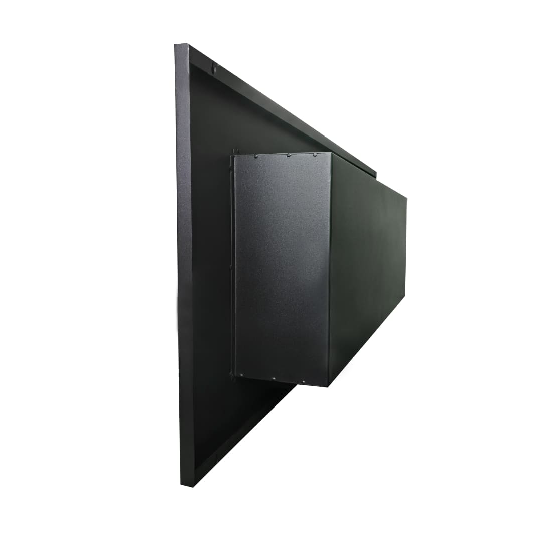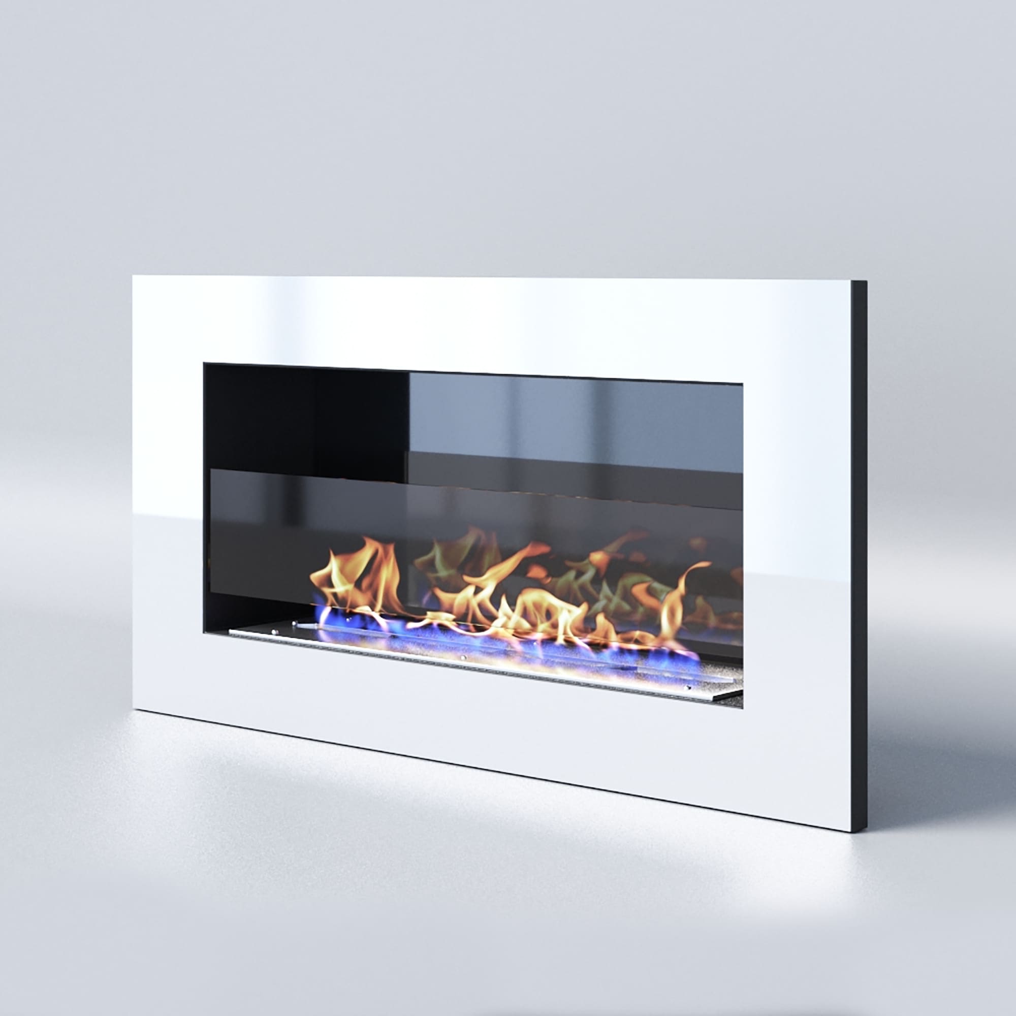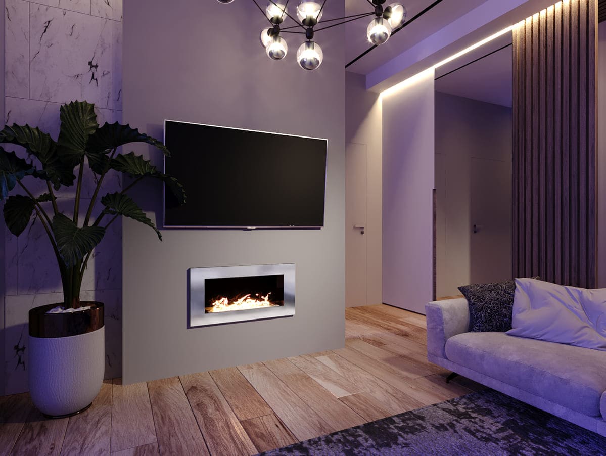- Декоративное стекло — крепится на всю заднюю стенку очага. За счет своего зеркального отражения, пламя визуально становится в 2 раза больше и кажется, что камин горит еще ярче.