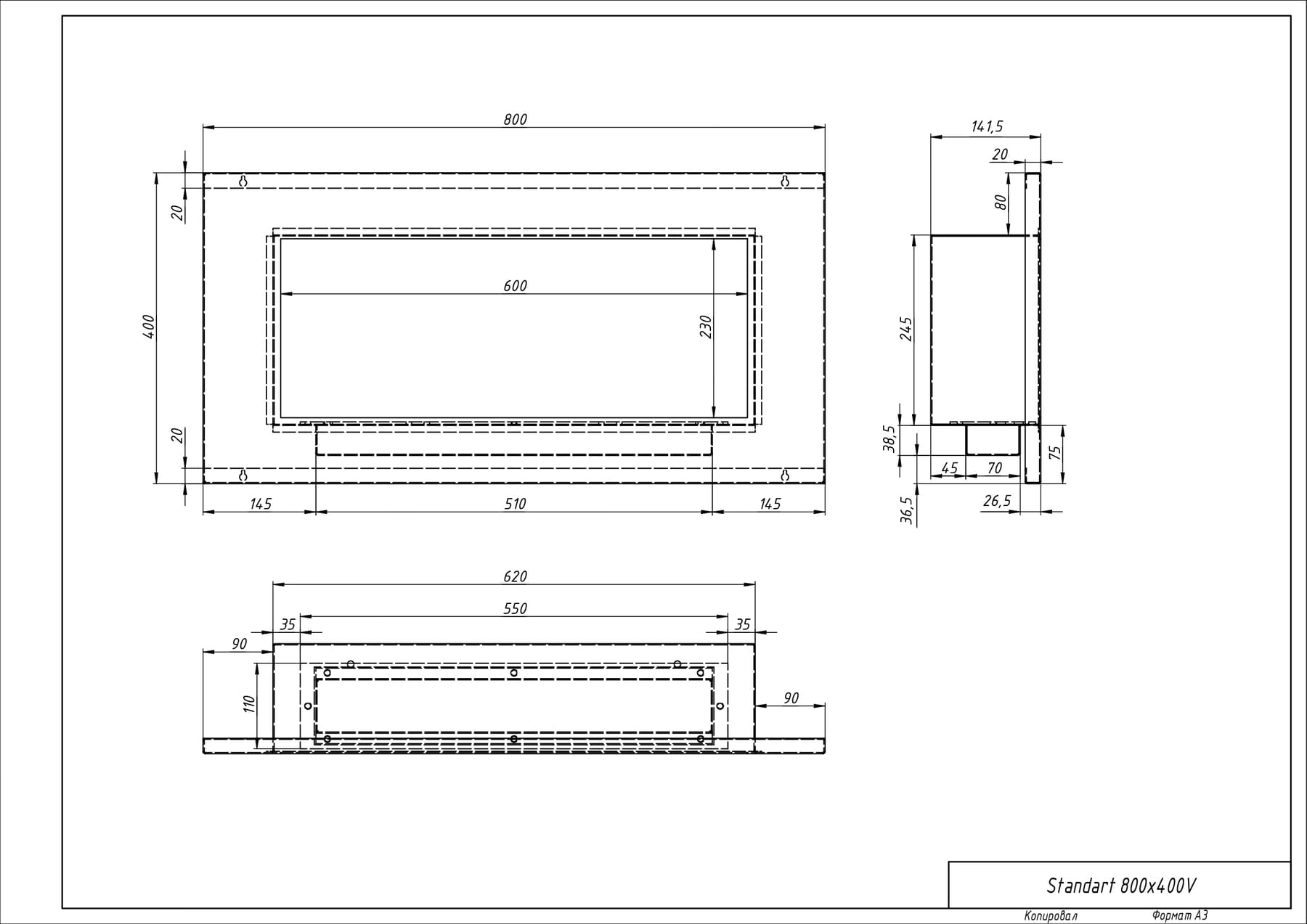 Встраиваемый биокамин «Хай-тек 800V» изготовлен из стали и нержавеющей стали, окрашен термостойкой порошковой краской.